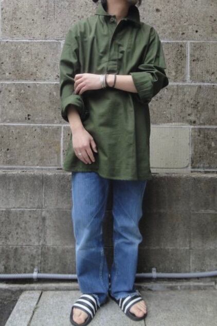 プルオーバータイプで着丈は長め、ゆったりとしたシルエットが特徴のシャツです。