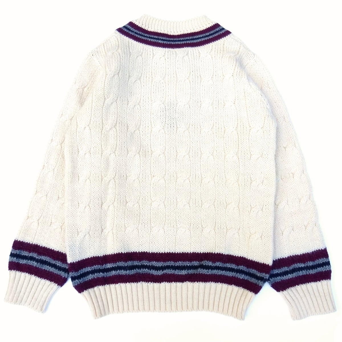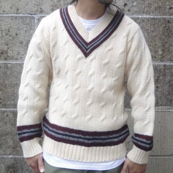 首元のVゾーン、袖、裾に入るカラーラインが特徴のチルデンセーターです。