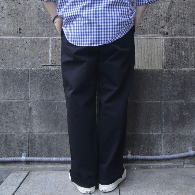 コットンツイルの生地感とワイドシルエットはそのままにスラッシュポケットの採用と膝から裾へかけてのシルエットを見直す事ですっきりとした印象に仕上がりました。
