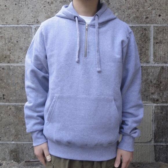 カンガルーポケットを配置したプルオーバー型のパーカーにハーフジップを採用する事で脱着を容易にさせるのと同時に胸元のジッパーがアクセントに。裏起毛を採用した柔らかな着心地と保温性の高さが特徴です。