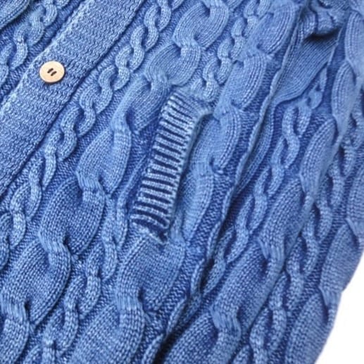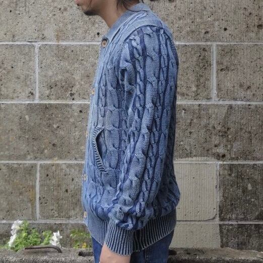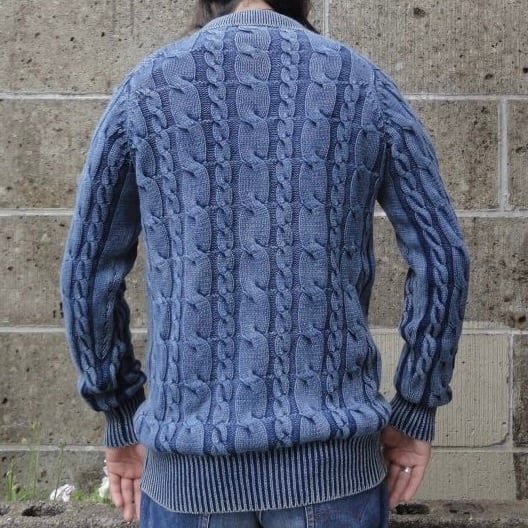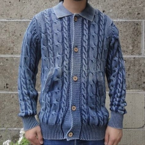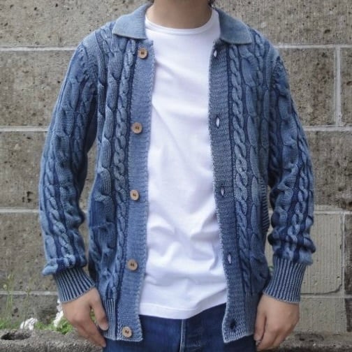インディゴ染色した糸を用いたケーブルパターンのジャケットです。