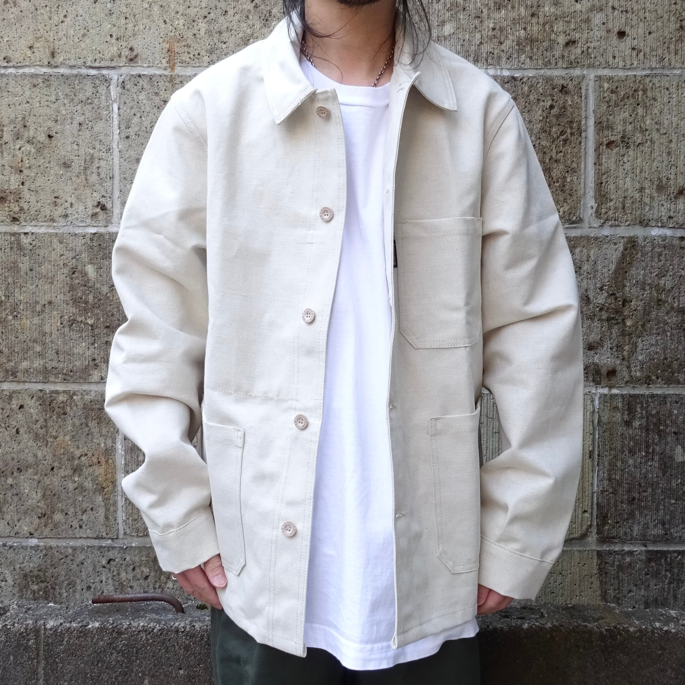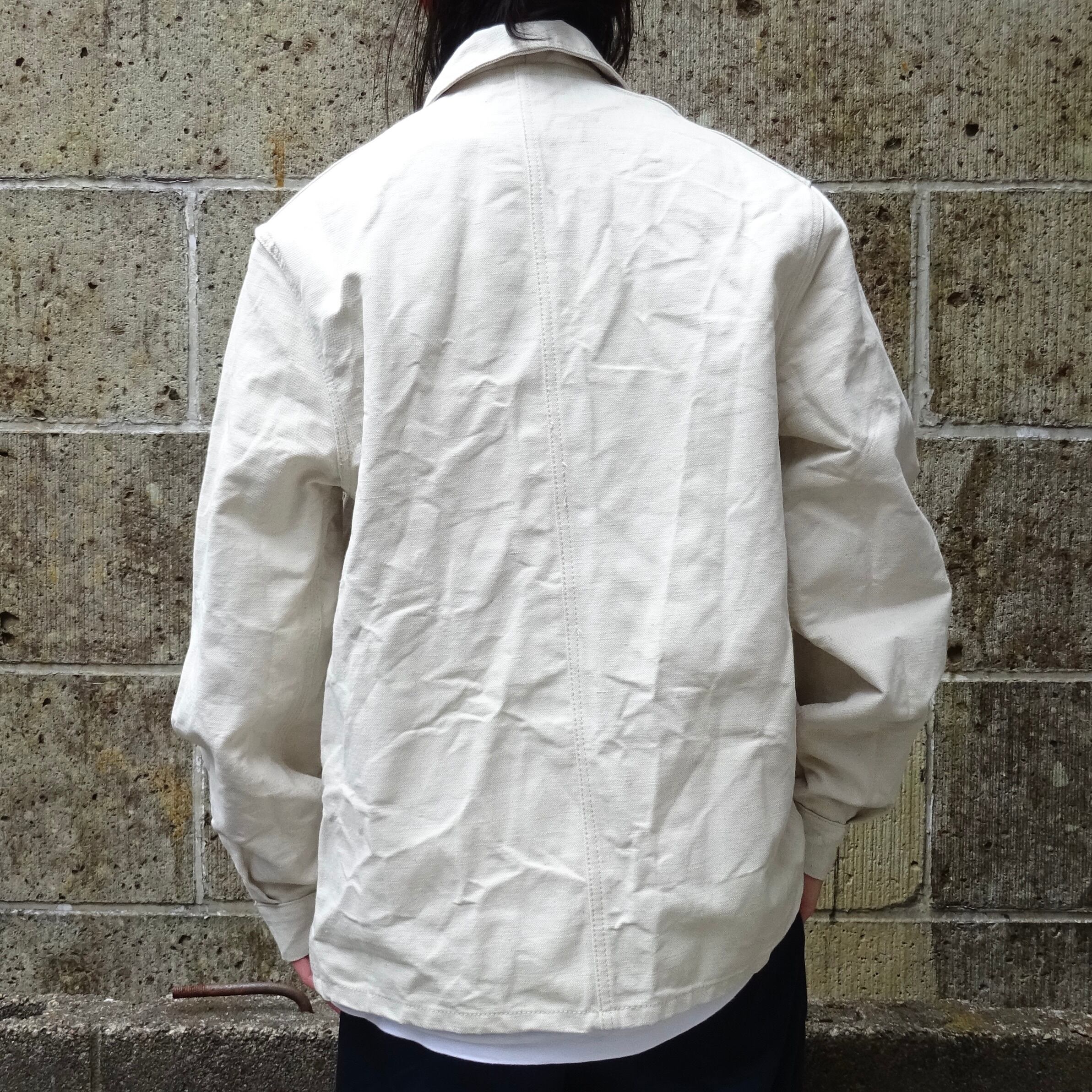 光沢を含んだ張りとシャリ感のある生地が特徴のフレンチワークを代表する型のワークジャケット。ウォッシュを施すことでより雰囲気ある表情へと変化します。